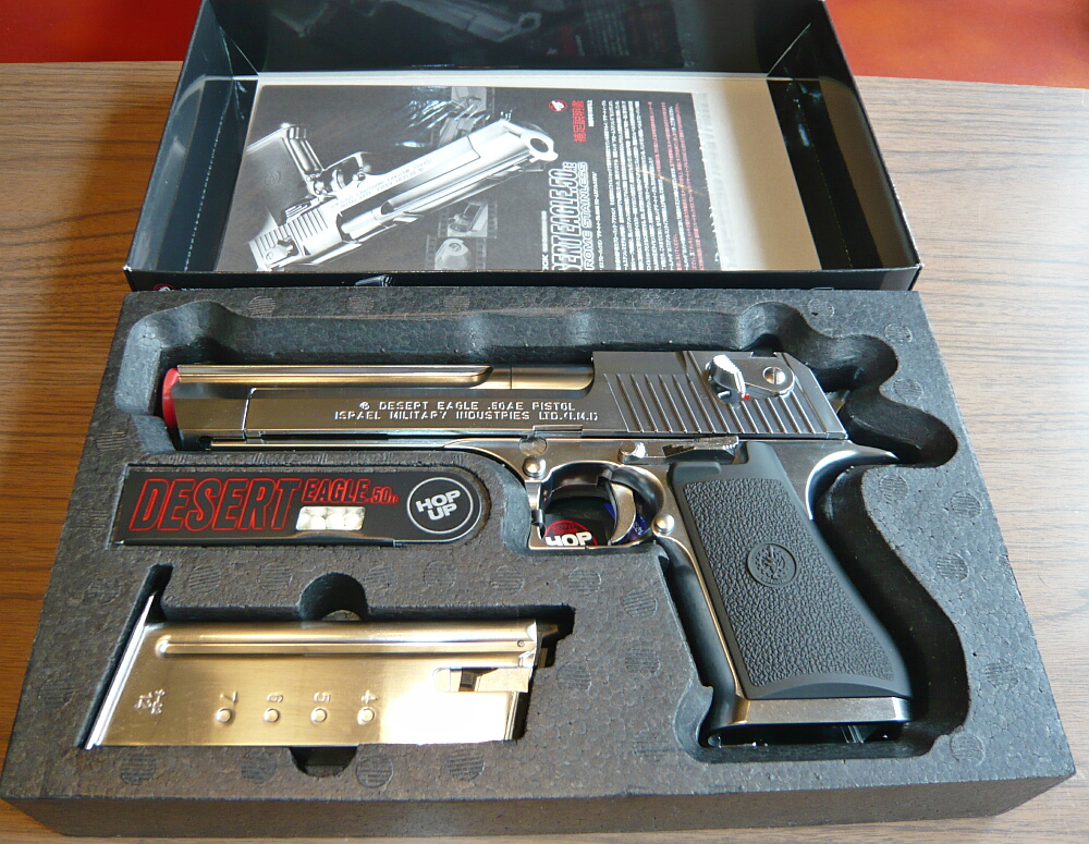 マルイのデザートイーグルは古くはエアコキ1900円シリーズに.44マグナムのモデルがあり、そこからかなり後になって.50AEモデルのガスブローバックが発売されました。しかしそれも2003年の事であり、少々今更感はあるのですが手を出してみました。黒い方のが安くてラフな使用でキズが入ったりしても気にならないのですが、銀色の方しか無かった…
