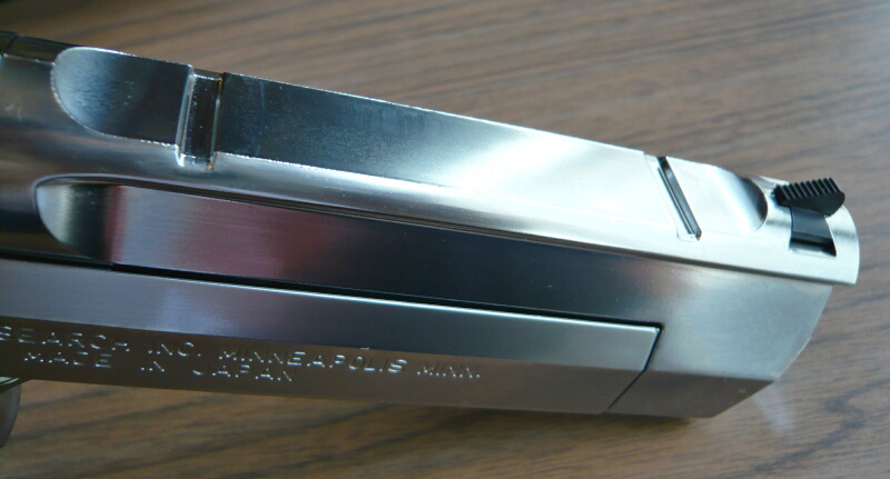 フロントサイトはSAAのシンプルな半月状のものから大柄なランプ(傾斜)タイプのものに変わっており、SAAとの明確な識別点でもあります。ランプ面にはセレーション(ギザギザ)があり、光の反射を抑えます。この製品はWディープブラックの美しいメッキがかけられた樹脂パーツに対して、亜鉛合金製のパーツの仕上げがごく普通の黒染めなので統一感が無いのが少々惜しいところでしょうか。