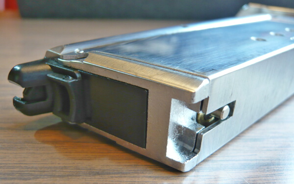 銃本体左右。クロームステンレスモデルはハイキャパ5.1ステンレスのような銀色塗装ではなく、メッキ処理がされています。表面はヌラヌラしたメッキ光沢ではなく半光沢といった風合いで、反射は抑え気味。