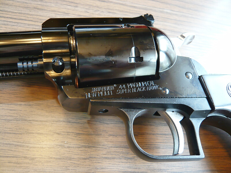 フレーム左面。シリンダーの下に刻印があり、「ニューモデル」・スーパーブラックホークである事が示されています。シリンダーは.44マグナム弾を使用するための強化としてフルート(溝)が省略され、シリンダー自体が巨大な円筒状の異様さを醸しています。