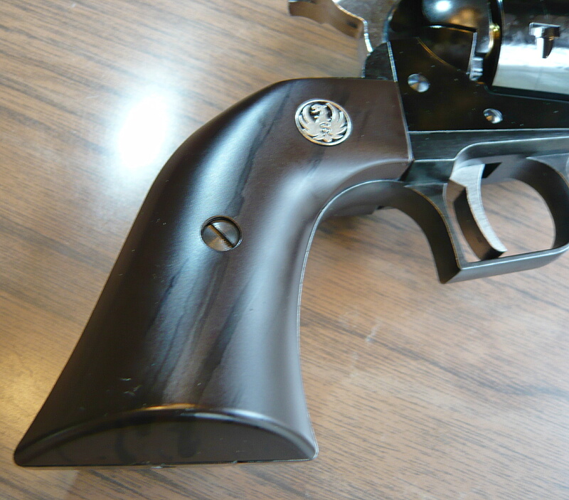 グリップはプラグリップ仕様なので樹脂製のもの。こげ茶色で木目様の黒い模様がプリントされています。スタームルガーのメダリオンがグリップ上方にあります。
