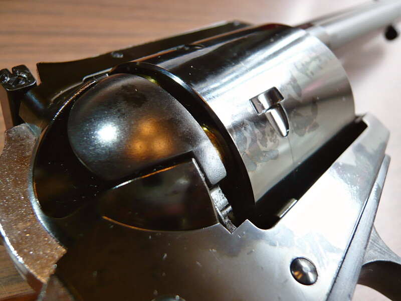 ここがシリンダー前面に噛み込んでシリンダーの動きを渋くする原因になっている部分ではあるのですが、新しいモデルほどここは動きが軽くされておりこの銃ではローディングゲートをあけてシリンダーを手で勢いよく回せばチャララーッと回る程度にまで軽くなっています。