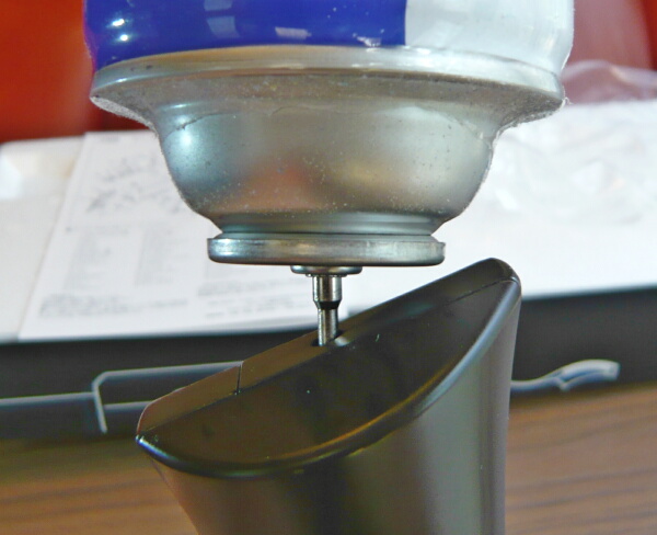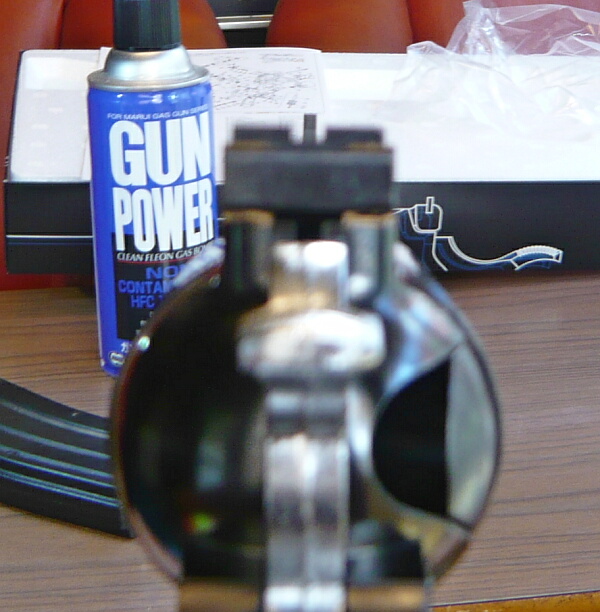 まずはガスをグリップ底部の注入口から注入します。注入口は少し後方に傾いています。