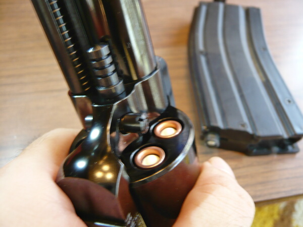 ローディングゲートを閉じたら準備完了。あとはハンマーを起こしてトリガーを引けば発射となります。