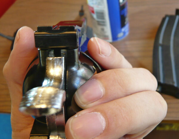 ローディングゲートを開くと連動してシリンダーストップが下がり、シリンダーのロックが解除されます。これでシリンダーが手で回せるようになります。ただし時計回りにのみで、半時計回りには回せません。