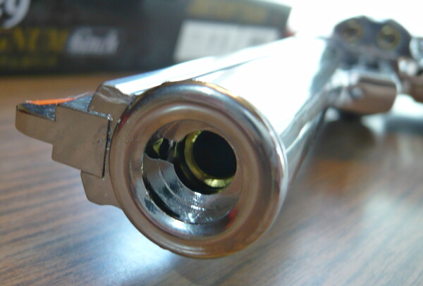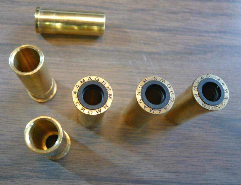 カートは真鍮製ですが弾頭部が無い独特な形状。.44マグナムというにはちょっと小さくてカートの外径は10.3mm、一段太くなっている部分の外周10.8mm、リム部の外周11.8mm、内径8mm、カート全長29mm。サイズ的には9mm×29R=.38spに近いサイズ。