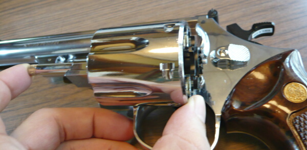 フレーム左のサムピースを押しながらシリンダーを右から押してスイングアウト。シリンダーの穴に筒が入っていてちょっと独特です。