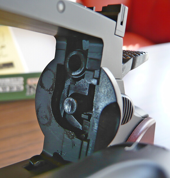 その上にハンマー、更にその上にリヤサイト。手動による別体のセーフティスイッチはありません。リヤサイトは樹脂主体の廉価なモデルにも関わらずフルアジャスタブル。