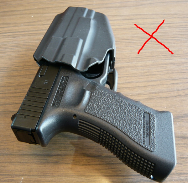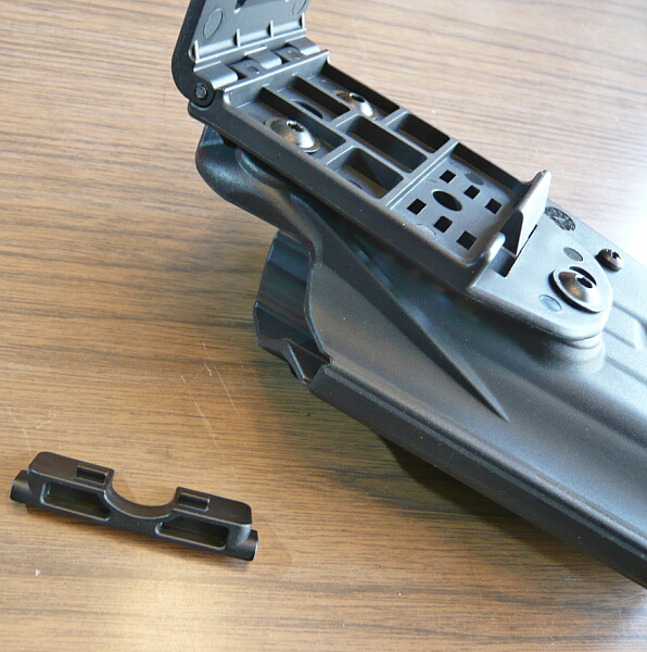 このホルスターはロック機構があり、トリガーガードを引っ掛けてロックしますがCQCホルスターがホルスターの表面に人差し指で操作するレバーがあってこれがうっかりトリガーを触る危険があったのに対し、このホルスターでは後面の位置にレバーがあり中指で操作するようになっています。人差し指でレバーを操作すると銃を抜いたあと構える際に両手で一旦保持して銃を掴み直す必要があるのでややスムーズさに欠きますが、その場合うっかりトリガーに触る事が無いのでより安全だともいえます。