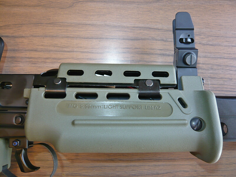 ハンドガード周辺。通常のL85とは別のタイプで、フロントサイトより先の部分がありません。カービンタイプもこれと同じタイプのハンドガードが使われています。色はオリーブドラブ。写真だと彩度が低くなっててフォリッジグリーンみたいに見えますが、実際はもう少し鮮やかな色です。