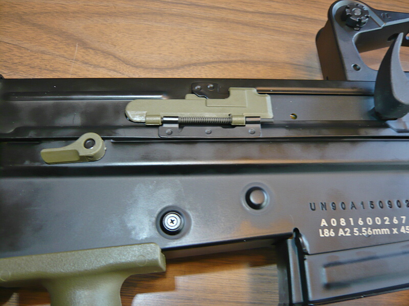 下になっているとフルオートポジション。シャキシャキしたタッチで重くはありませんが軽くもありません。銃を構えた状態ではかなり窮屈な位置にあるので操作性は良くありません。本当、どこもかしこも操作性の悪さに辟易してしまいますが、これがL85/L86という銃。そういう部分こそがこの銃のロマン部分。