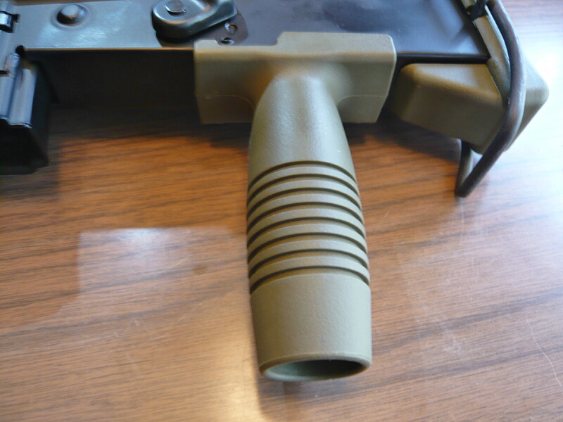 セレクターの下、レシーバー後方下面にはフォアグリップが装着されています。これはL86特有のものですが、バイポッドを地に付けてそこを軸にストック部分を左右に振って銃口を標的に向けるため、右手でメインのグリップを握っている時はここを左手で保持して銃尾を左右に操作します。
